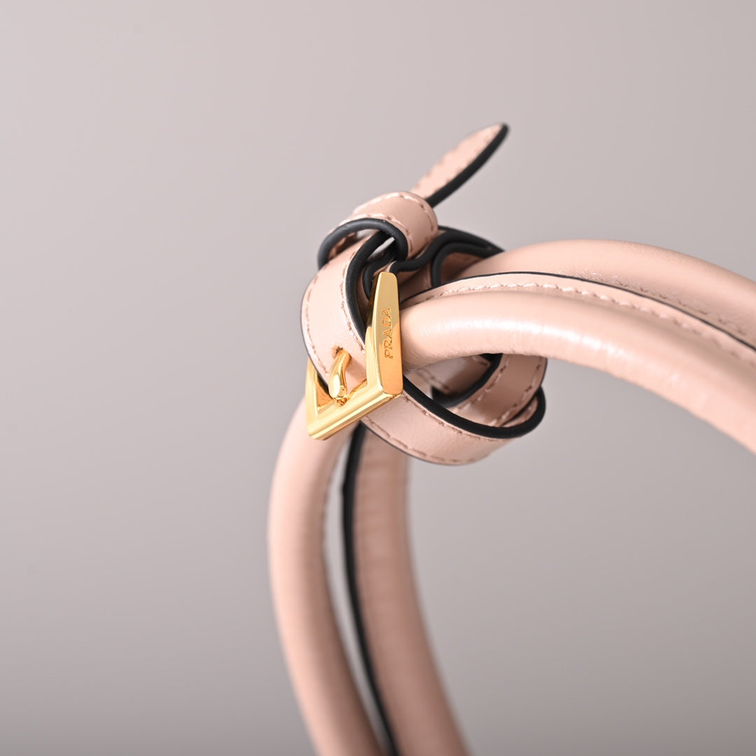 This pragmatic and refined handbag is made of soft leather with a glossy finish that emphasizes its versatile, modern allure. The geometric design blends different influences into one style with a distinctive but sleek aesthetic. Embellished by the sophisticated strap detail, the rectangular silhouette has zipper pockets inside. The enameled metal triangle logo completes the look with its iconic signature.